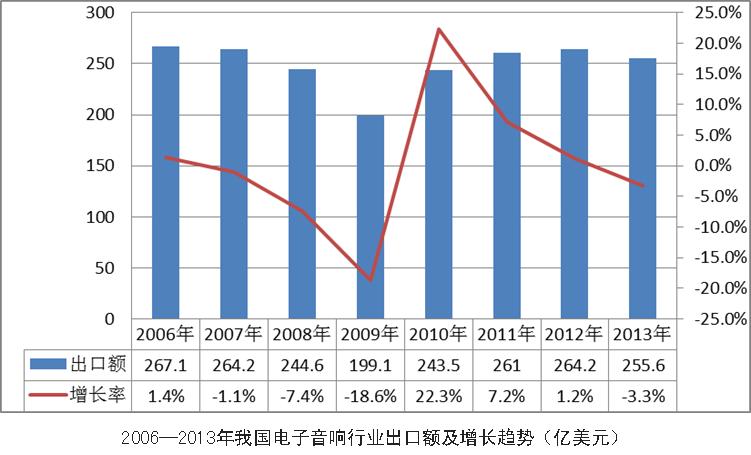 延續(xù)了2012年第四季度下滑趨勢(shì),受限于全球經(jīng)濟(jì)尤其是歐美發(fā)達(dá)國(guó)家經(jīng)濟(jì)的緩慢復(fù)蘇,歐美傳統(tǒng)市場(chǎng)對(duì)于電子產(chǎn)品的需求低迷,使我國(guó)電子音響出口市場(chǎng)受到一定打擊。2013年,我國(guó)電子音響行業(yè)實(shí)現(xiàn)出口額達(dá)255.6億美元,同比下降3.3%,增速比上年回落4.5個(gè)百分點(diǎn),低于全國(guó)電子信息產(chǎn)品出口額增速15.2個(gè)百分點(diǎn),占全國(guó)電子信息產(chǎn)品出口比重達(dá)3.3%。其中,整機(jī)產(chǎn)品出口額達(dá)127.3億美元,同比下降6.7%;關(guān)鍵配套件出口額達(dá)128.3億美元,同比增長(zhǎng)0.5%。