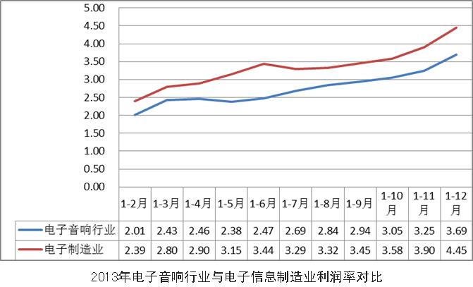 2013年,我國(guó)電子音響行業(yè)實(shí)現(xiàn)主營(yíng)業(yè)務(wù)收入2400.7億元,同比下降1%,低于去年同期3個(gè)百分點(diǎn);實(shí)現(xiàn)利潤(rùn)88.6億元,同比下降4.8%。行業(yè)實(shí)現(xiàn)利潤(rùn)率3.69%,低于電子信息制造業(yè)平均水平0.76個(gè)百分點(diǎn)。企業(yè)生產(chǎn)經(jīng)營(yíng)的成本壓力較大,盈利水平偏低。