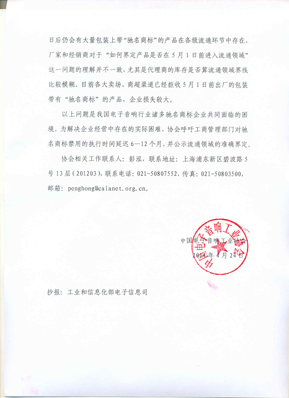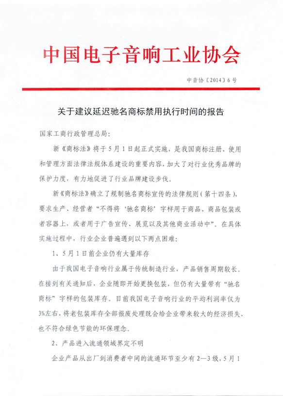 這些問題是我國電子音響行業(yè)諸多馳名商標(biāo)企業(yè)面臨的共性問題。為解決企業(yè)經(jīng)營(yíng)中存在的實(shí)際困難,協(xié)會(huì)已于四月正式向國家有關(guān)部門報(bào)告,請(qǐng)求有關(guān)部門在具體實(shí)施的過程中設(shè)置一定時(shí)間的“緩沖期”。