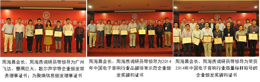 2014年11月26日,在中國電子音響行業(yè)協(xié)會第九屆理事會第二次會議上,協(xié)會發(fā)布了2014年中國電子音響行業(yè)質(zhì)量品牌建設(shè)活動的評選結(jié)果(中音協(xié)[2014]20號)。國光電器、華錄?松下、漫步者、銳豐音響、東原電子、寶業(yè)恒、漢高股份、恩寶電子(排名不分先后)等八家企業(yè)榮獲“中國電子音響行業(yè)質(zhì)量標(biāo)桿”稱號。湖山電器、銳豐音響、寶業(yè)恒、漢高股份、三德大康(排名不分先后)等五家企業(yè)榮獲“中國電子音響行業(yè)品牌培育示范企業(yè)”稱號。在隨后進(jìn)行的頒獎儀式上,工業(yè)和信息化部電子信息司調(diào)研員周海燕博士和協(xié)會周海昌會長共同為獲獎單位頒發(fā)了證書?,F(xiàn)將獲獎名單予以公示。