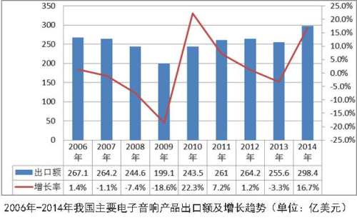 自1999年開始,我國主要電子音響產(chǎn)品產(chǎn)值以平均每年超過30%的增速上升,至2006年,產(chǎn)值已達2069.4億元。但是,受企業(yè)產(chǎn)能過剩、用工成本增加、原材料價格上漲、人民幣升值等因素綜合影響,我國主要電子音響產(chǎn)品產(chǎn)值增速從2006年開始放緩,并于2007年開始出現(xiàn)負增長。在企業(yè)還未完全消化上述不良因素時,2008年開始國際金融危機、歐債危機又席卷全球,產(chǎn)品出口面臨嚴峻形勢。2010年行業(yè)雖然實現(xiàn)恢復性增長,產(chǎn)值恢復到危機前水平,但隨著國際市場經(jīng)濟復蘇的低迷,行業(yè)總體處于低速調(diào)整期。2014年,由于國際市場的復蘇和我國居民收入增長較快、網(wǎng)絡零售保持旺盛,國內(nèi)國際市場均取得了良好的發(fā)展,行業(yè)消費熱點如通訊器材的配套音箱、耳機等產(chǎn)品繼續(xù)保持熱度,行業(yè)復蘇態(tài)勢明顯。