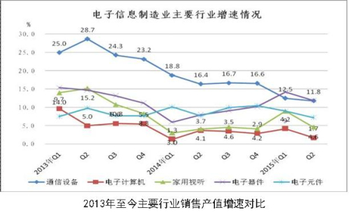 2015年1-6月,我國電子信息制造業(yè)運行平穩(wěn),在各工業(yè)行業(yè)中保持了較高的景氣程度,企業(yè)利潤率穩(wěn)步回升,內(nèi)銷占比持續(xù)擴大,通信設(shè)備行業(yè)增速小幅回暖,中西部地區(qū)保持平穩(wěn)增長。