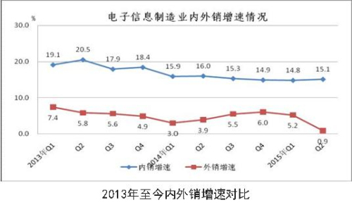 國內(nèi)消費市場的拉動作用逐漸加強,1-6月,規(guī)模以上電子信息制造業(yè)實現(xiàn)內(nèi)銷產(chǎn)值27610億元,同比增長15.1%,高于1-5月1個百分點,高出全行業(yè)平均水平7.1個百分點。出口交貨值23873億元,同比增長0.9%,低于1-5月0.9個百分點,低于全行業(yè)平均水平7.1個百分點。內(nèi)銷比重逐步擴大,2014年10月-2015年6月,內(nèi)外銷產(chǎn)值比重分別為49.7:50.3、49.7:50.3、49.9:50.1、51.8:48.2、52.2:47.8、52.7:47.3、52.8:47.2、53.6:46.4。