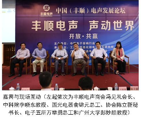 隨后,中科院教授李曉東、豐順電聲商會會長馮禮見、國光電器總工俞錦元、電子五所總工萬舉勇、豐順縣委書記陳志寧、縣長曾永祥等介紹了國內(nèi)外電聲技術(shù)發(fā)展趨勢和評價豐順電聲行業(yè)發(fā)展情況,電聲產(chǎn)業(yè)在電子信息產(chǎn)業(yè)中的重要作用和發(fā)展創(chuàng)新,豐順電聲產(chǎn)業(yè)的發(fā)展情況等內(nèi)容。專家圍繞論壇主題從各自層面自由發(fā)言并現(xiàn)場互動。