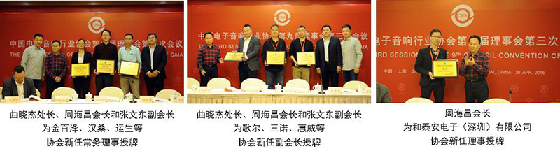 隨后,協(xié)會第九屆理事會審議并表決通過了張文東副會長所做的《關(guān)于調(diào)整中國電子音響行業(yè)協(xié)會第九屆理事會的提案》。會議決定增補歌爾聲學(xué)股份有限公司為副會長單位,姜龍為副會長;增補深圳市三諾聲智聯(lián)股份有限公司為副會長單位,劉志雄為副會長;增補珠?;萃萍加邢薰緸楦睍L單位,姚洪波為副會長;增補深圳市金百澤電子科技股份有限公司為常務(wù)理事單位,武守坤為常務(wù)理事;增補漢桑(南京)科技有限公司為常務(wù)理事單位,王斌為常務(wù)理事;增補廣州市運生信息科技有限公司為常務(wù)理事單位,鄧清桃為常務(wù)理事;增補合泰安電子(深圳)有限公司為理事單位,高濤為理事。會議認(rèn)為,調(diào)整后的理事會綜合了行業(yè)特點、產(chǎn)業(yè)分類、地區(qū)分布、政治條件、熱心協(xié)會工作等多種因素,體現(xiàn)了行業(yè)代表性、廣泛性和影響力,更有利于行業(yè)發(fā)展。隨后,會議向新任理事會成員授牌。
