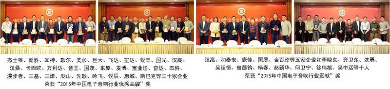 會議審議并表決通過了仇錫洪副會長所做的《關(guān)于2015年中國電子音響行業(yè)優(yōu)秀企業(yè)評選結(jié)果的提案》。國光、歌爾、漫步者、通力、三諾、杰科、三基、惠威、湖山、華錄、巨大、飛達(dá)、杰士萊、銳豐、音王、東原、寶業(yè)恒、奮達(dá)、先歌、天樂等二十家企業(yè)榮獲“2015年中國電子音響行業(yè)二十強”稱號;杰士萊、新科、耳神、歌爾、美加、巨大、飛達(dá)、笙達(dá)、銳豐、國光、漢高、漢桑、卡西歐、萬利達(dá)、音王、國茂、東原、麥博、寶業(yè)恒、奮達(dá)、杰科、漫步者、三基、三諾、湖山、先歌、吟飛、悅辰、惠威、斯巴克等三十家企業(yè)榮獲“2015年中國電子音響行業(yè)優(yōu)秀品牌”獎;漢高、合泰安、康佳、國展、金百澤等五家企業(yè)和李曉東(中科院聲學(xué)所)、齊衛(wèi)東(冠亦數(shù)碼)、沈勇(南大聲學(xué)所)、吳祖恒(矽諾微)、曾德鈞(云動科技)、楊春(律美聲頻)、趙新華(電子標(biāo)準(zhǔn)研究院)、何衛(wèi)寧(花都區(qū)科信局)、徐偉根(花都區(qū)電子行業(yè)協(xié)會)、吳中活(恩平市電聲行業(yè)協(xié)會)等十人榮獲“2015年中國電子音響行業(yè)貢獻(xiàn)”獎。會議認(rèn)為,對2015年行業(yè)發(fā)展中作出顯著貢獻(xiàn)的企業(yè)和個人進(jìn)行表彰,有利于弘揚和展示中國電子音響行業(yè)的發(fā)展成果,有利于進(jìn)一步推動中國電子音響產(chǎn)業(yè)升級和產(chǎn)業(yè)結(jié)構(gòu)調(diào)整。隨后,會議向獲獎單位和個人授牌。