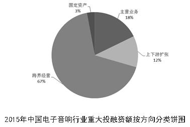 《白皮書》以行業(yè)6家上市公司(歌爾聲學(xué)、國光電器、漫步者、奮達(dá)科技、共達(dá)電聲、TCL通力;飛達(dá)公報未出、新嘉聯(lián)重組)為例,統(tǒng)計了在2015年共發(fā)生的30項重大投融資項目,涉及資金53.6億元。其中:涉及主營業(yè)務(wù)的9項,資金9.7億,約占投資總額的18%;涉及上下游擴(kuò)張的9項,資金6.4億,約占投資總額的12%;涉及跨界經(jīng)營的9項,資金36.9億,約占投資總額的67%;涉及土地等固定資產(chǎn)投資的3項,資金1.6億,約占投資總額的3%。