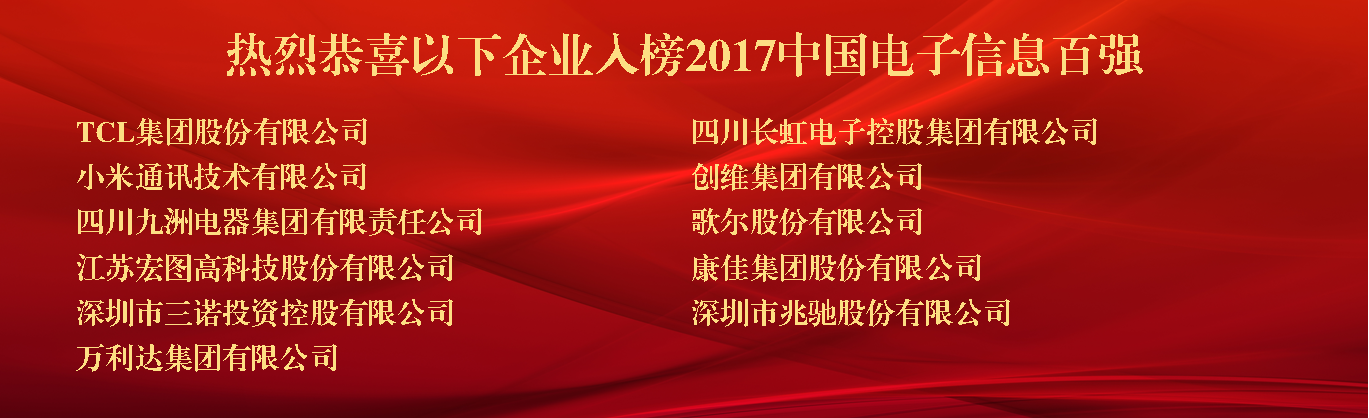 7月21日,根據(jù)地方行業(yè)主管部門及相關(guān)協(xié)會初審?fù)扑],經(jīng)中國電子信息行業(yè)聯(lián)合會組織專家進(jìn)行綜合評定,2017年(第三十一屆)中國電子信息百強企業(yè)(以下簡稱百強企業(yè))名單于貴州遵義揭曉。華為技術(shù)有限公司連續(xù)十屆位居榜首,聯(lián)想集團(tuán)、海爾集團(tuán)分列第二、第三名。協(xié)會祝賀TCL、長虹、小米、創(chuàng)維、九洲、歌爾、宏圖、康佳、三諾、兆馳、萬利達(dá)等會員企業(yè)入榜。