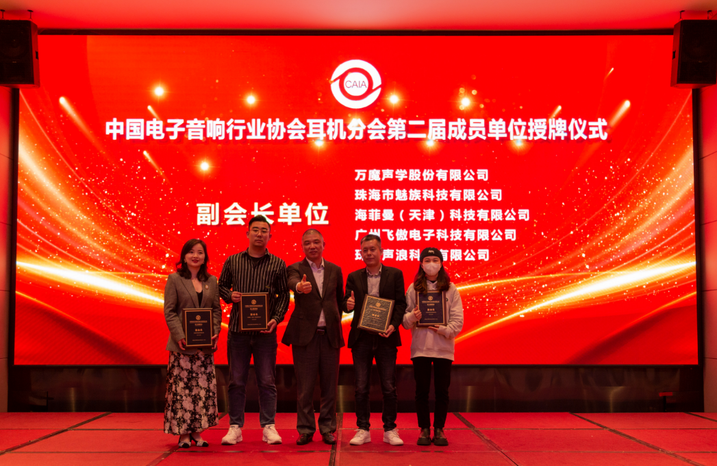 最后,協(xié)會常務(wù)副會長、耳機分會會長陳立新,協(xié)會副秘書長彭泓,耳機分會秘書長陳然和副會長陳允海分別為耳機分會第二屆副會長、常務(wù)理事、理事會以及會員單位頒發(fā)了獎牌。