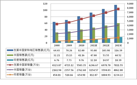 圖:2008-2013年發(fā)展中國家和地區(qū)、印度多媒體音箱銷售及預測