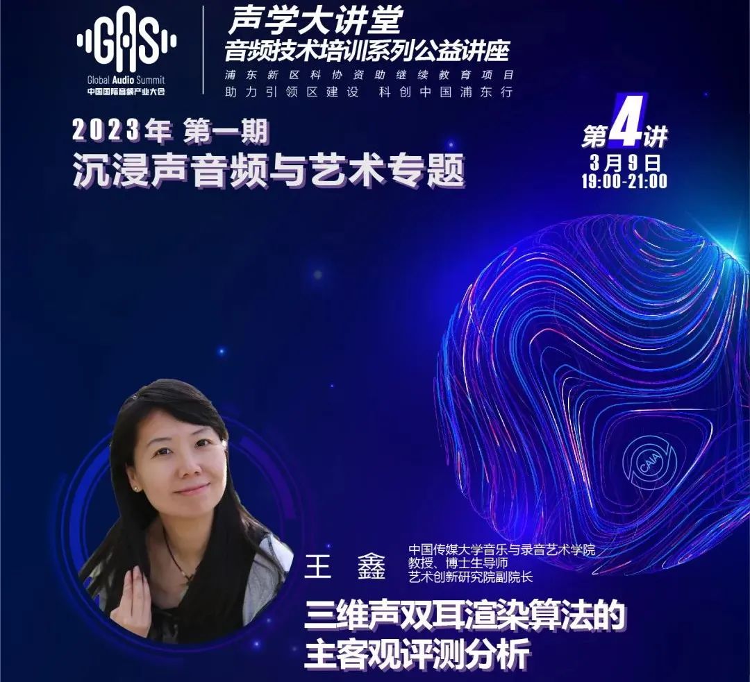 《2023GAS聲學(xué)大講堂音頻技術(shù)培訓(xùn)系列公益講座》沉浸聲音頻與藝術(shù)專題第四講于3月9日?qǐng)A滿完成。本期演講嘉賓為中國傳媒大學(xué)音樂與錄音藝術(shù)學(xué)院教授、藝術(shù)創(chuàng)新研究院副院長(zhǎng)王鑫,主題是《三維聲雙耳渲染算法的主客觀評(píng)測(cè)分析》。北京科技大學(xué)教授、工業(yè)設(shè)計(jì)系副主任王曉慧主持。