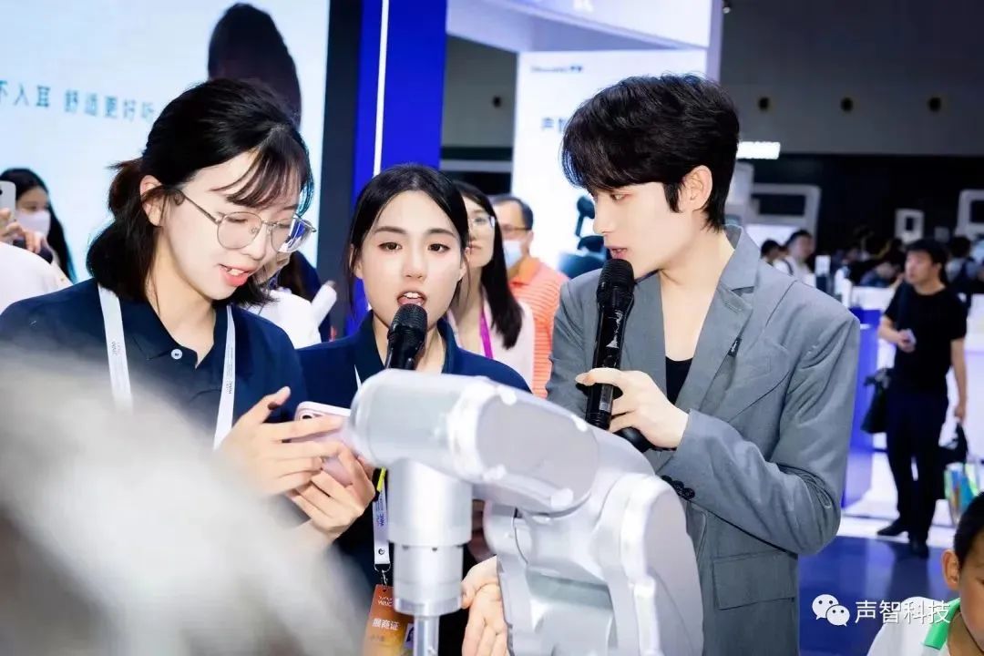 聲智形象大使井朧現(xiàn)場分享他嘗鮮使用云耳耳機(jī)的親身體驗(yàn),也與觀眾一起感受聲智前沿人工智能技術(shù)與應(yīng)用——Azero機(jī)械臂與“小易寫作”。