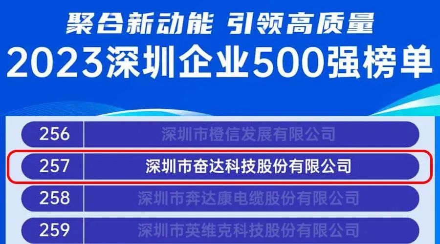 奮達(dá)科技榮獲2023年深圳500強企業(yè)稱號