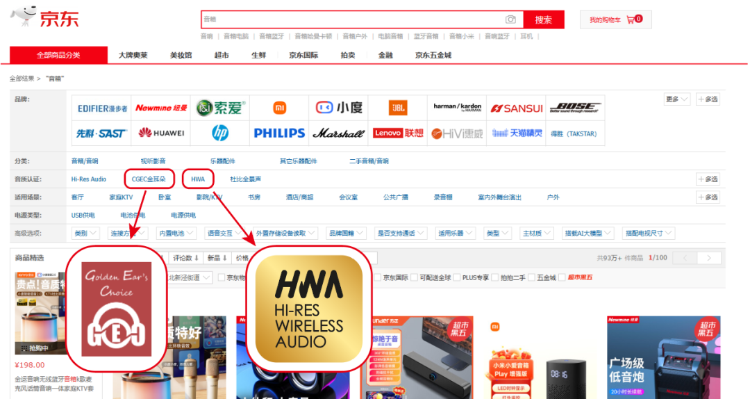 即日起只需在京東首頁搜索“音箱”,你便可以在音質(zhì)認(rèn)證欄目中選擇 CGEC 和 HWA 選項(xiàng),從而挑選到由中國電子音響行業(yè)協(xié)會(huì)優(yōu)選的高品質(zhì)音箱產(chǎn)品,為消費(fèi)者開啟極致的聽覺盛宴。