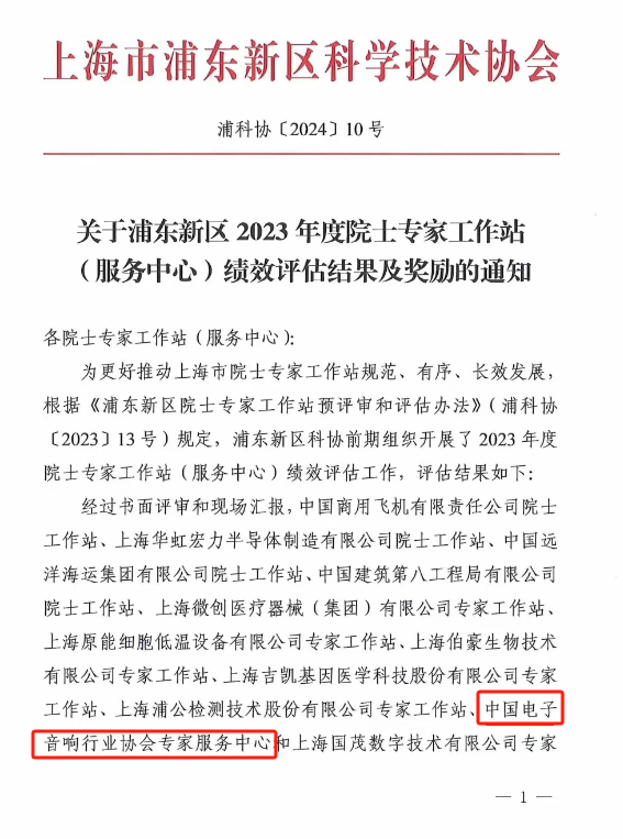 近日,中國(guó)電子音響行業(yè)協(xié)會(huì)專家服務(wù)中心榮獲浦東新區(qū)2023年度院士專家工作站(服務(wù)中心)績(jī)效評(píng)估“優(yōu)秀”單位稱號(hào)。這一榮譽(yù)是對(duì)協(xié)會(huì)服務(wù)質(zhì)量和專業(yè)能力的高度認(rèn)可。