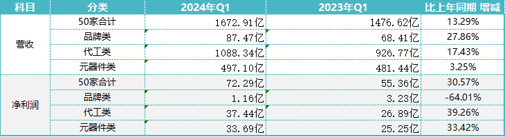 在2024年一季度,中國(guó)電子音響行業(yè)受益于市場(chǎng)需求的回暖和政策支持的持續(xù)推進(jìn),整體表現(xiàn)優(yōu)于同期。截至2024年5月22日,根據(jù)中國(guó)電子音響行業(yè)在A股上市的50家企業(yè)抽樣統(tǒng)計(jì),其中品牌類4家,代工類13家,元器件類33家,已經(jīng)全部披露完2024年一季度財(cái)務(wù)數(shù)據(jù)。這50家上市公司(可比數(shù)據(jù)50家,下同)2024年一季度合計(jì)營(yíng)業(yè)收入1672.91億元人民幣,同比增長(zhǎng)13.29%;合計(jì)凈利潤(rùn)72.29億元人民幣,同比增長(zhǎng)30.57%。