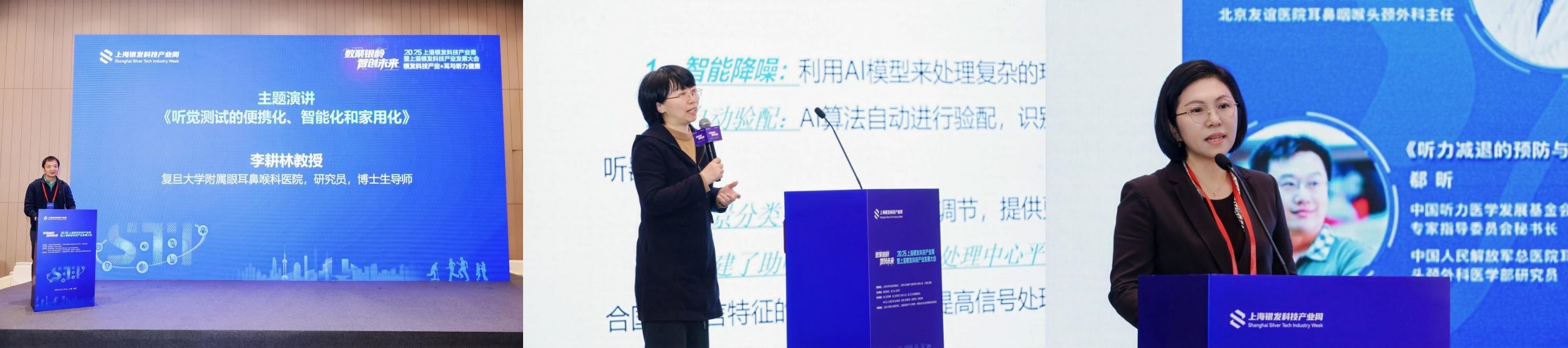 學(xué)界代表則分享了前沿探索。復(fù)旦大學(xué)附屬眼耳鼻喉科醫(yī)院研究員李耕林正推動聽覺測試向家庭化、便攜化發(fā)展;華東師范大學(xué)教授桑晉秋則展示了AI在復(fù)雜場景下降噪與語音增強(qiáng)的實際效果;中國聽力醫(yī)學(xué)發(fā)展基金會執(zhí)行副秘書長甄麗霞介紹了其構(gòu)建的全鏈條聽力健康保障體系,致力于通過技術(shù)提升服務(wù)可及性。