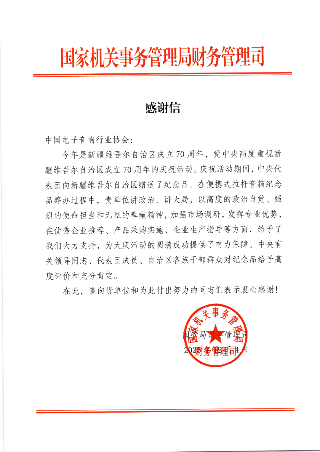 近日,國(guó)家機(jī)關(guān)事務(wù)管理局財(cái)務(wù)管理司中國(guó)電子音響行業(yè)協(xié)會(huì)寄送了感謝信,這是對(duì)協(xié)會(huì)在新疆維吾爾自治區(qū)成立70周年紀(jì)念品籌辦過(guò)程中的工作表示感謝,并表?yè)P(yáng)了協(xié)會(huì)講政治、講大局,以高度的政治自覺、強(qiáng)烈的使命擔(dān)當(dāng)和無(wú)私的奉獻(xiàn)精神,加強(qiáng)市場(chǎng)調(diào)研,發(fā)揮專業(yè)優(yōu)勢(shì),在優(yōu)秀企業(yè)推薦、產(chǎn)品采購(gòu)實(shí)施、企業(yè)生產(chǎn)指導(dǎo)等方面,給予了大力支持。中央有關(guān)領(lǐng)導(dǎo)同志、代表團(tuán)成員、自治區(qū)各族干部群眾對(duì)紀(jì)念品給予高度評(píng)價(jià)和充分肯定。