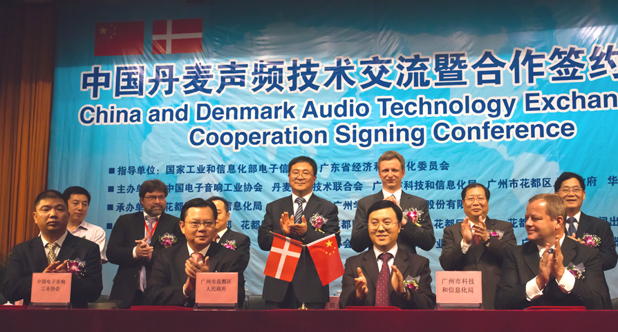 中國(guó)電子音響工業(yè)協(xié)會(huì)、廣州市花都區(qū)人民政府、廣州市科技和信息局及丹麥聲頻技術(shù)聯(lián)合會(huì)簽訂了中國(guó)音響之都建設(shè)合作備忘錄中國(guó)丹麥交流會(huì)