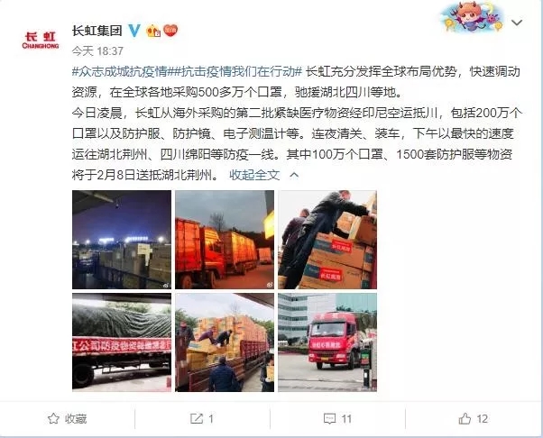 長(zhǎng)虹集團(tuán)發(fā)揮全球布局優(yōu)勢(shì),采購(gòu)500多萬(wàn)個(gè)口罩,馳援湖北、四川等地