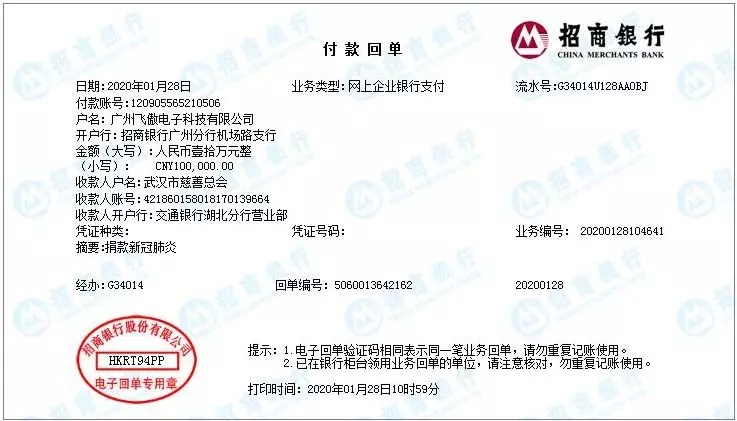 飛傲宣布向武漢市慈善總會(huì)捐款10萬(wàn)元。