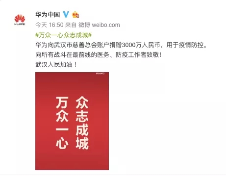 1月26日,華為向武漢市慈善總會(huì)賬戶捐贈(zèng)3000萬(wàn)元,用于疫情防控。