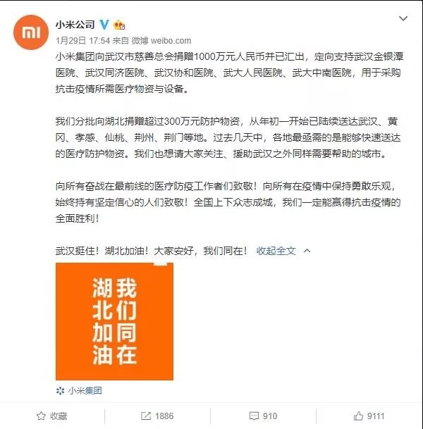 小米集團(tuán)捐贈(zèng)1000萬(wàn)元及價(jià)值超過(guò)300萬(wàn)元的防護(hù)物資