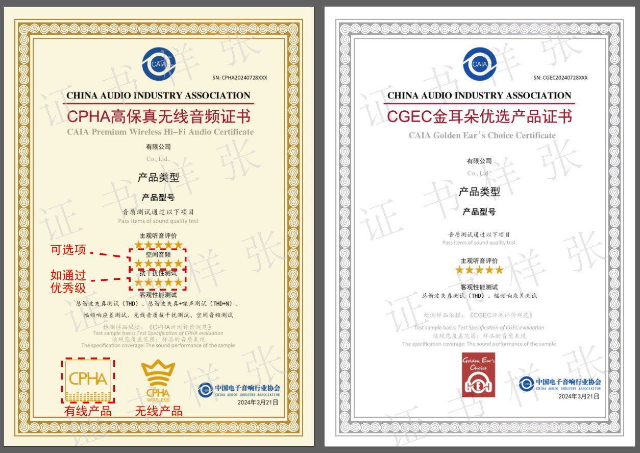 協(xié)會將綜合客觀檢測結(jié)果和主觀評價結(jié)果(客觀檢測報告由企業(yè)提供,費用自理),對符合要求的產(chǎn)品發(fā)放商標使用授權(quán)書,通過產(chǎn)品將可在產(chǎn)品外觀及包裝上使用“金耳朵選擇(CGEC)”/高保真音頻產(chǎn)品(CPHA)LOGO。