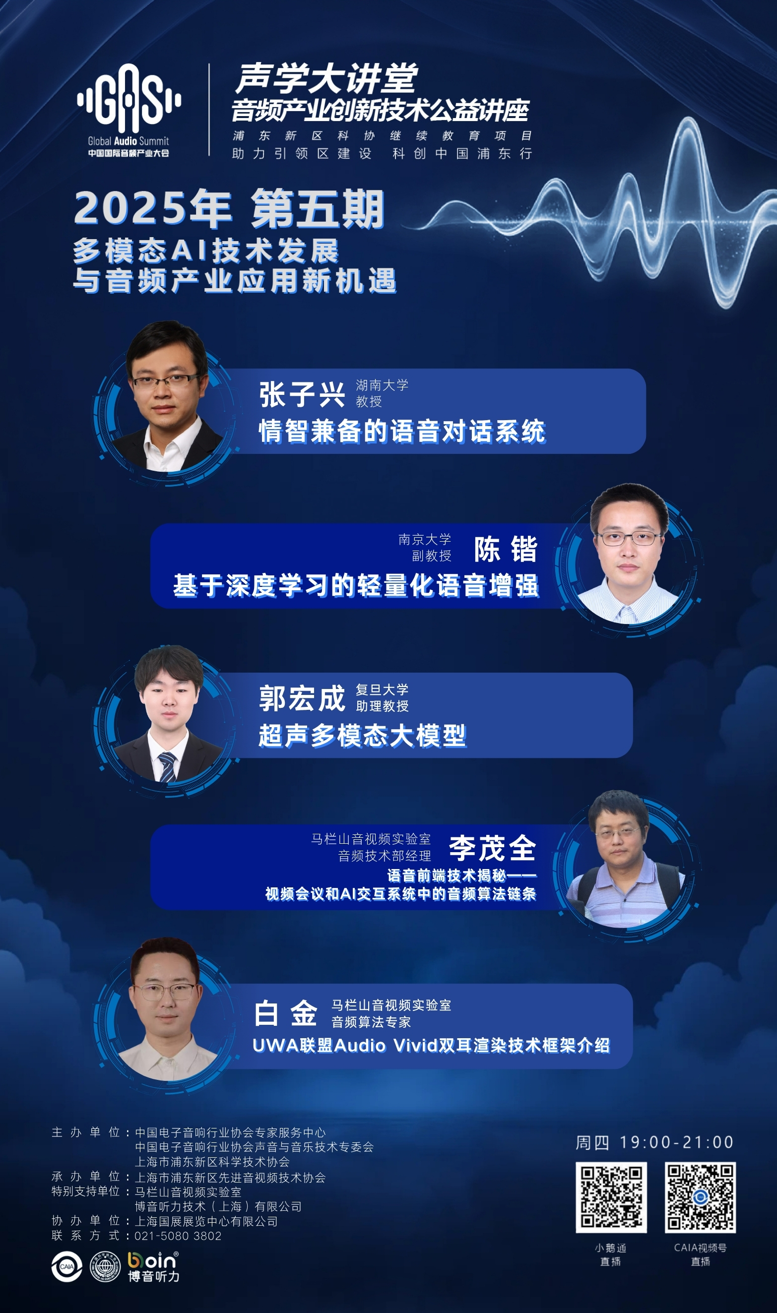 《2025GAS聲學(xué)大講堂—音頻產(chǎn)業(yè)創(chuàng)新技術(shù)公益講座》多模態(tài)AI技術(shù)發(fā)展與音頻產(chǎn)業(yè)應(yīng)用新機(jī)遇專題,講座第1講將于10月16日周四19點(diǎn)開講,本次邀請了湖南大學(xué)教授張子興演講,講座主題:《情智兼?zhèn)涞恼Z音對話系統(tǒng)》。此次直播方式為中國電子音響行業(yè)協(xié)會視頻號和小鵝通。感謝博音聽力技術(shù)(上海)有限公司對2025年聲學(xué)大講堂的支持。感謝馬欄山音視頻實(shí)驗(yàn)室對本期聲學(xué)大講堂的大力支持!